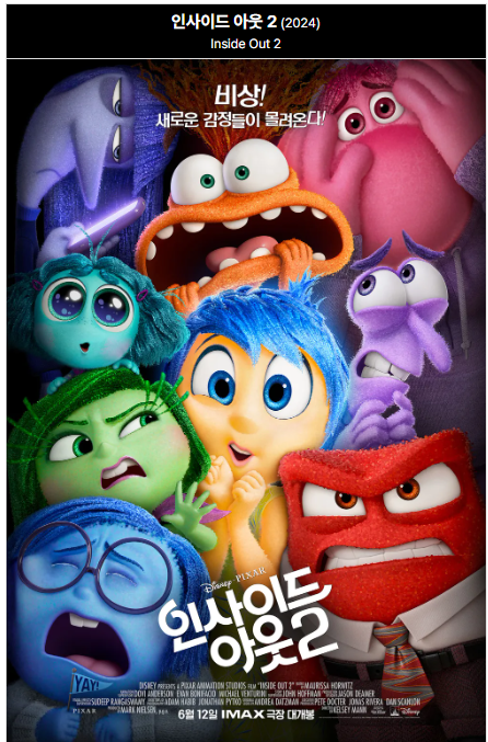 2015년 7월에 개봉한 애니메이션 영화 "인사이드 아웃"은 Pixar의 15번째 장편 애니메이션 걸작으로, 1억 7,500만 달러를 들여 제작하였으며 월드 박스 오피스 8억 5,880만 달러를 기록했고 국내 박스 오피스 3위를 차지했습니다. 2024년 6월에 개봉하여 불과 1주일 만에 250만을 동원한 "인사이드 아웃 2"는 2억 달러를 들여 제작했으며 7월 말일 기준 6억 1,340억 달러를 기록 중에 있습니다. 침체기에 빠져있던 픽사를 최정상으로 올려놓은 작품으로 평가받은 영화입니다. 실관람객들의 평가는 호평이 일색이었습니다. "사랑스럽고 감정적이며 깊은 공감이 된다. 나 자신을 돌아보는 시간이었고 다시 보고 싶다. 불안에 시달리는 나를 위한 영화였다'등 별점 9개 이상의 댓글들이 포진되어 있습니다. 현재 픽사 흥행 1위는 "인크레더블 2"인데 흥행순위에도 변동이 생기지 않을까 내심 기대해 봅니다.
