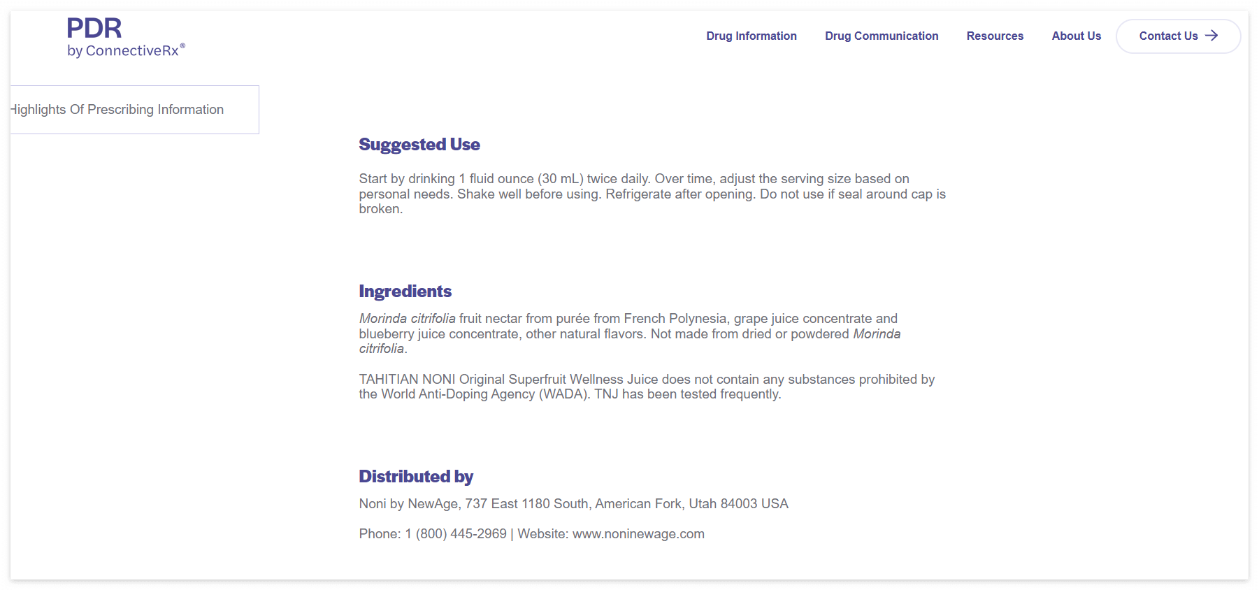 다음은 위 사이트 주소 PDR에 등재되어 있는 노니에 대해서 구글 번역 정리한 내용입니다.